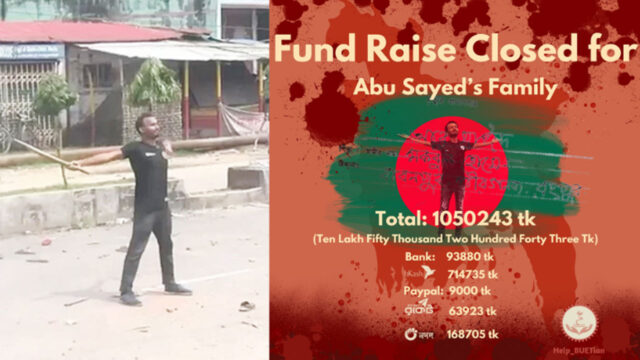 বুয়েটিয়ান পেজ থেকে জানানো হয়, বুধবার রাত সাড়ে ১০টা পর্যন্ত আবু সাঈদের পরিবারের সহায়তায় ১০ লাখ ৫০ হাজার ২৪৩ টাকা জমা হয়েছে। এর মধ্যে বিকাশে সাত লাখ ১৪ হাজার ৭৩৫ টাকা, নগদে এক লাখ ৬৮ হাজার ৭০৫ টাকা, রকেটে ৬৩ হাজার ৯২৩ টাকা, ব্যাংকে ৯৩ হাজার ৮৮০ টাকা এবং পেপালের মাধ্যমে নয় হাজার টাকা জমা হয়েছে।