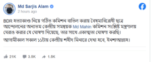 পোস্টে সারজিস লেখেন, বিডিআর হত্যাকাণ্ড নিয়ে গঠিত কমিশন বাতিল করায় বৈষম্যবিরোধী ছাত্র আন্দোলনের অন্যতম কেন্দ্রীয় সমন্বয়ক মো. মাহিন কমিশন সংশ্লিষ্ট মন্ত্রণালয় ঘেরাও করার যে ঘোষণা দিয়েছে, তার সঙ্গে একাত্মতা ঘোষণা করছি। মঙ্গলবার (১৭ ডিসেম্বর) সকাল ১১টায় কেন্দ্রীয় শহীদ মিনারে দেখা হবে বলেও ওই পোস্টে জানান তিনি।
