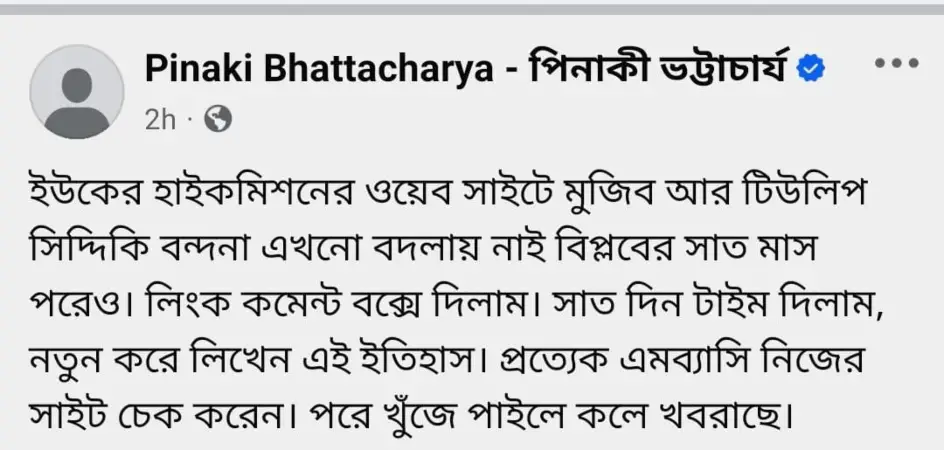 দেশজুড়ে: লেখক, ব্লগার ও অনলাইন অ্যাক্টিভিস্ট পিনাকী ভট্টাচার্য তাঁর অফিশিয়াল ফেসবুক পেইজে এক স্ট্যাটাসে বলেছেন, ইউকের হাইকমিশনের ওয়েব সাইটে মুজিব আর টিউলিপ সিদ্দিকি বন্দনা এখনো বদলায় নাই বিপ্লবের সাত মাস পরেও। সাত দিন টাইম দিলাম, নতুন করে লিখেন এই ইতিহাস। প্রত্যেক অ্যাম্বাসি নিজের সাইট চেক করেন। পরে খুঁজে পাইলে কলে খবর আছে।